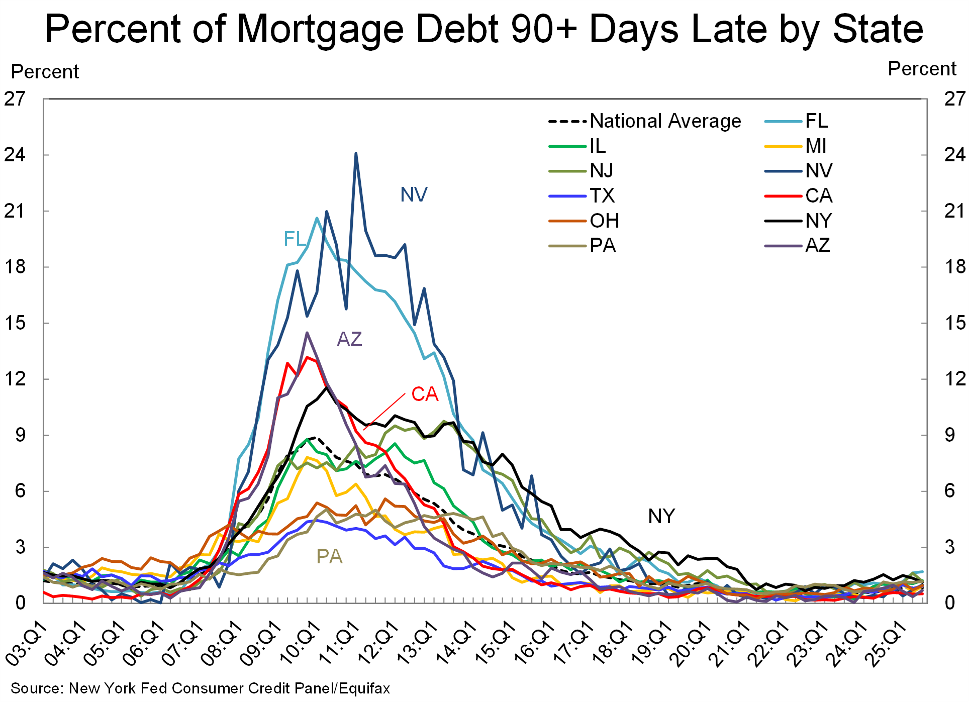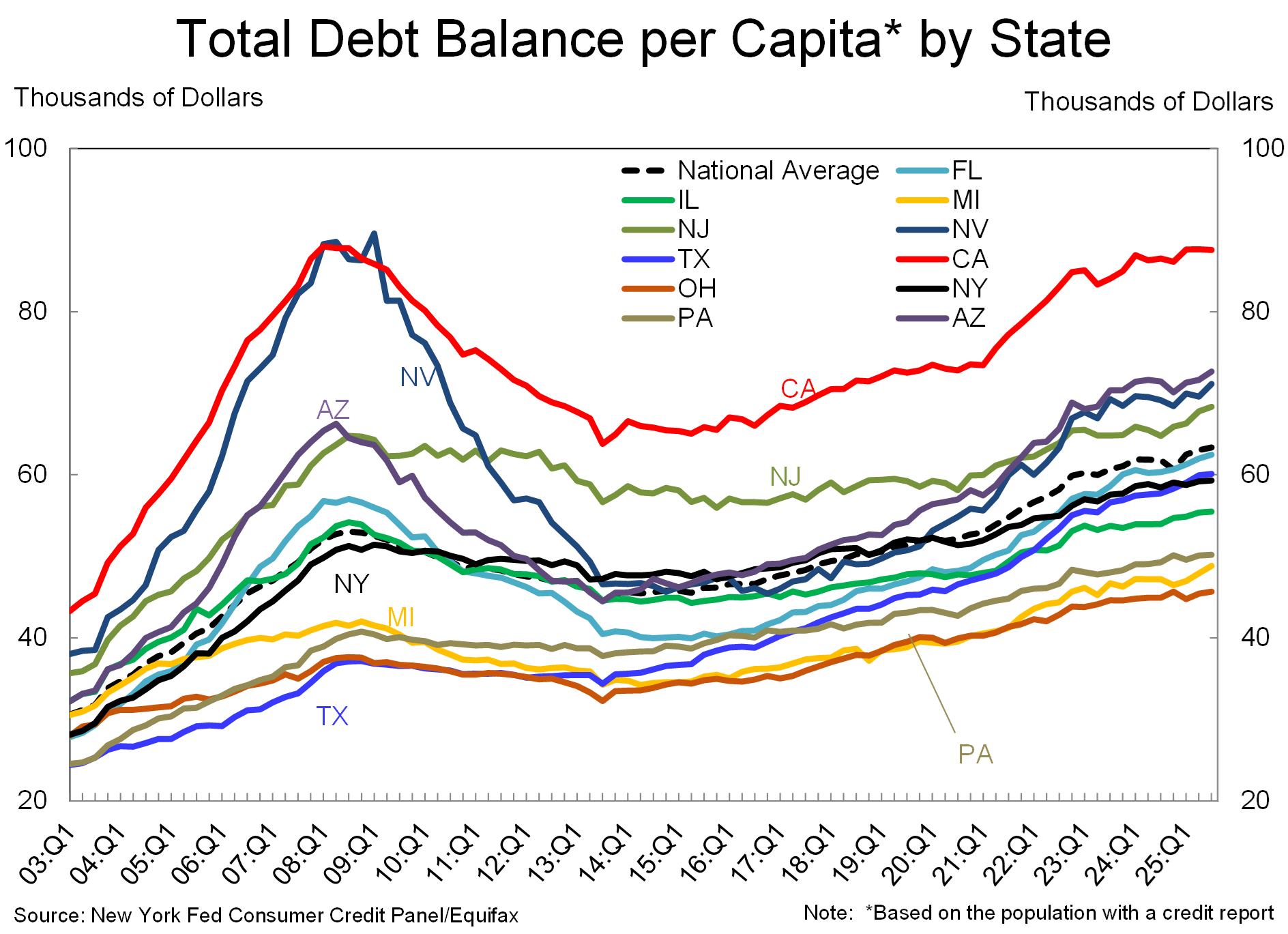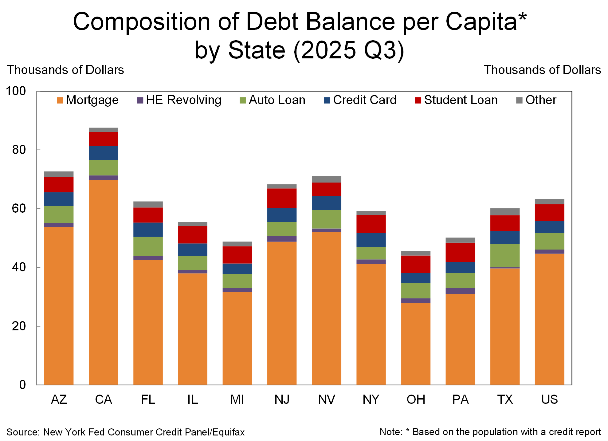 - As true nationally, the composition of the per capita debt balance (broken down by mortgages, Home Equity Line of Credit (HELOC) Revolving, auto loans, credit cards, student loans and other) is heavily skewed towards mortgages, with per capita mortgage debt at 71.3% in 2025Q3, but below the California figure of 79.7%. Auto loans account for 7.0% in New Jersey while student loans account for a heftier 9.7%.