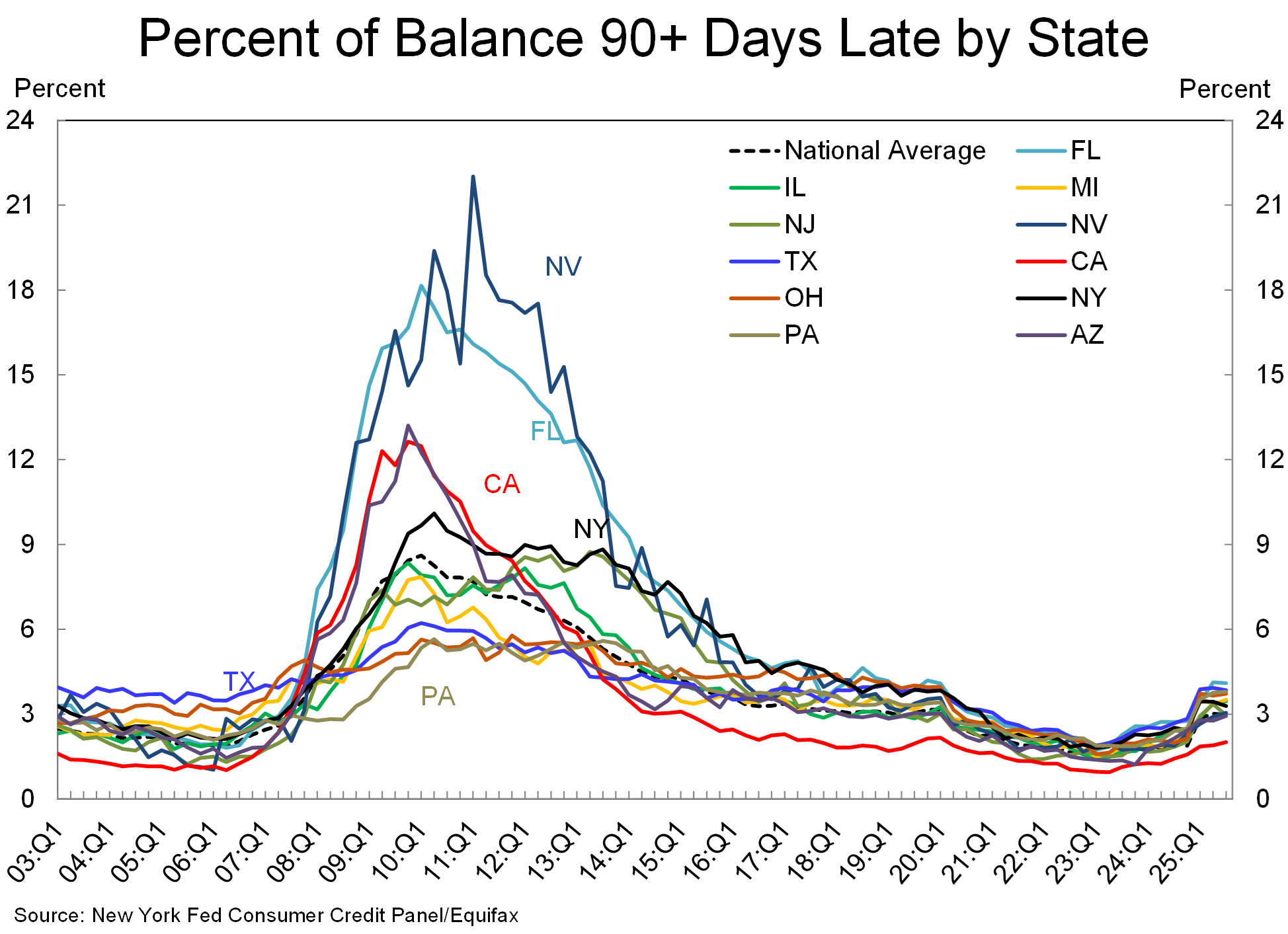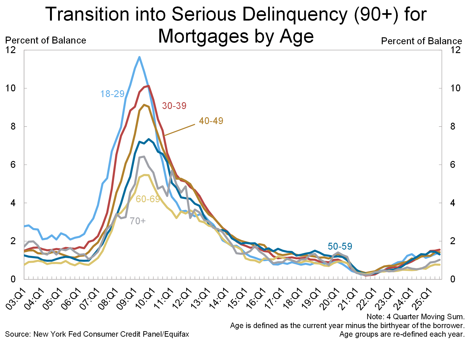 - The good news thus far is that mortgage delinquency rates remain moderate. New Jersey’s percent of mortgage debt 90+ days late moderated to 1.2% in 2025Q3 versus 1.6% in 2025Q2 but still depicts a sharp increase from the 0.8% figure seen in 2024Q3. These figures are also above the national average. The national data shows an alarming jump in the transition into serious delinquency (90+ days late, captured as a four-quarter moving sum) for the 30-39 age group. This group is the most vulnerable group during economic downturn.
