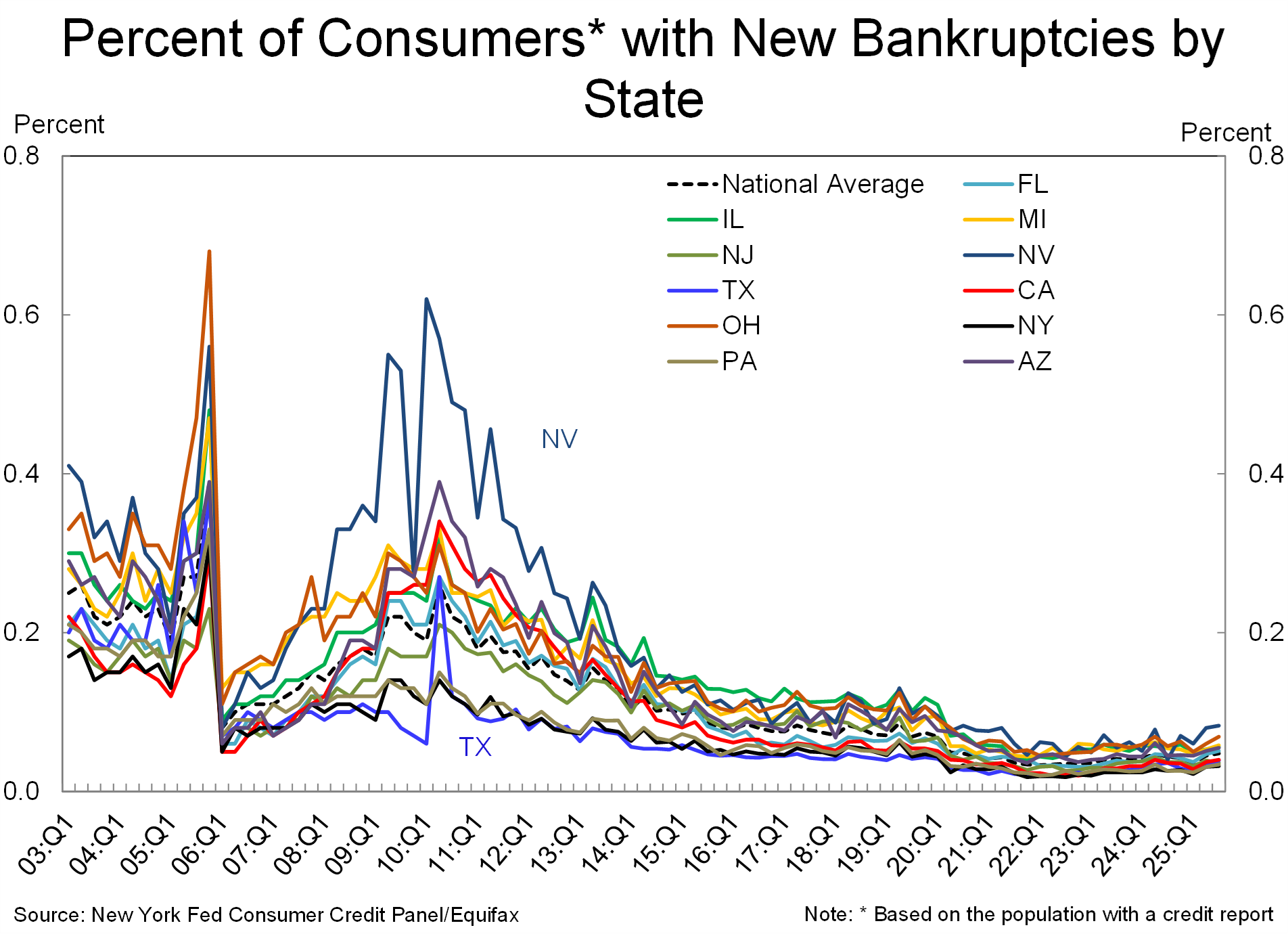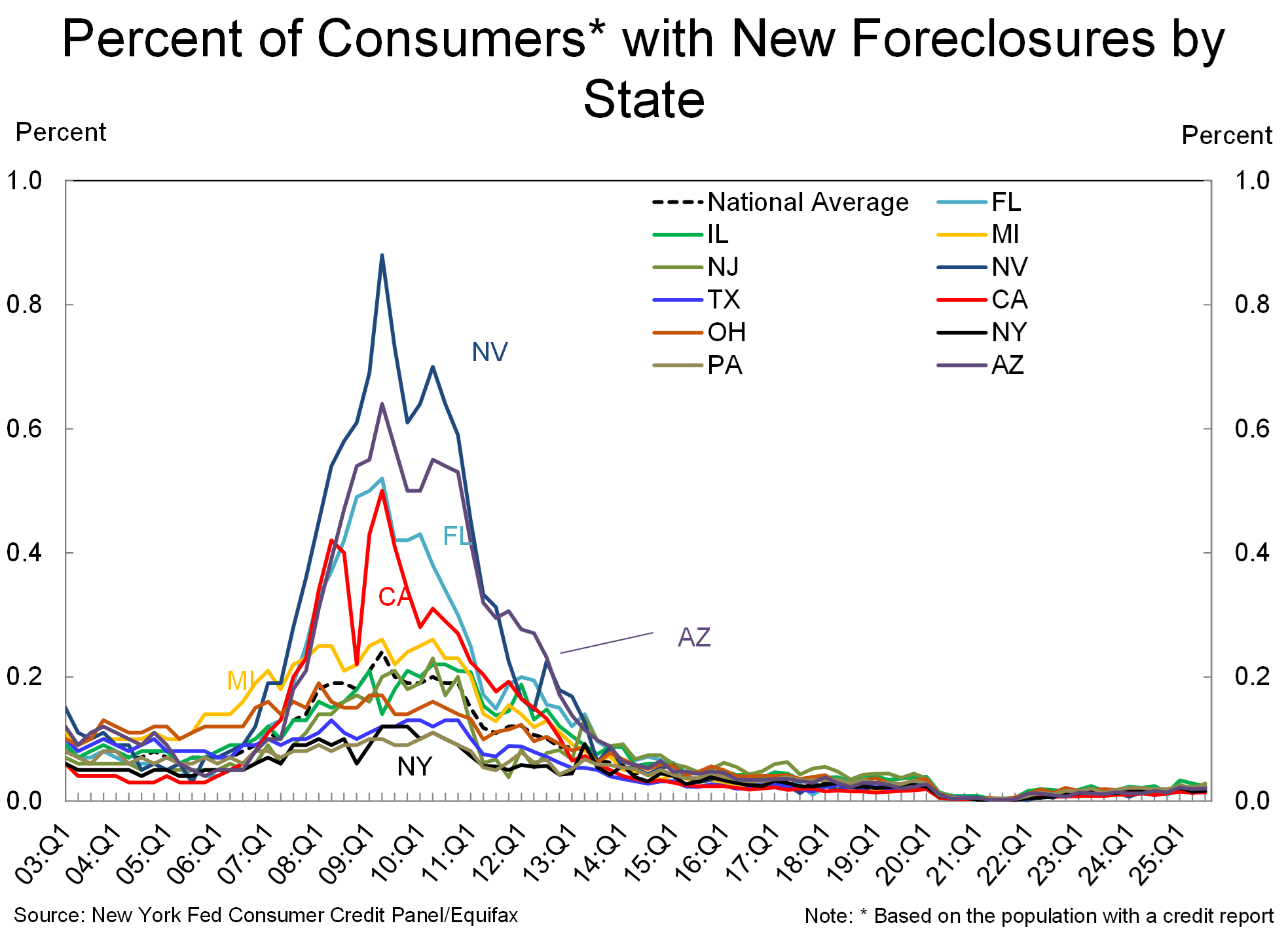 - Consumers with new foreclosures in New Jersey remain moderate at 0.03%, but above the national average of 0.02%. This is a trend worth watching, since the rates did spike during the Great Recession of 2008-2009. The percentage of consumers with new bankruptcies remains moderate as well. It was at 0.04% in 2025Q3, below the national average of 0.05%.