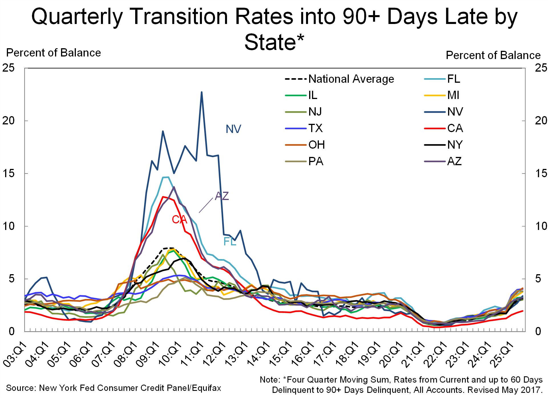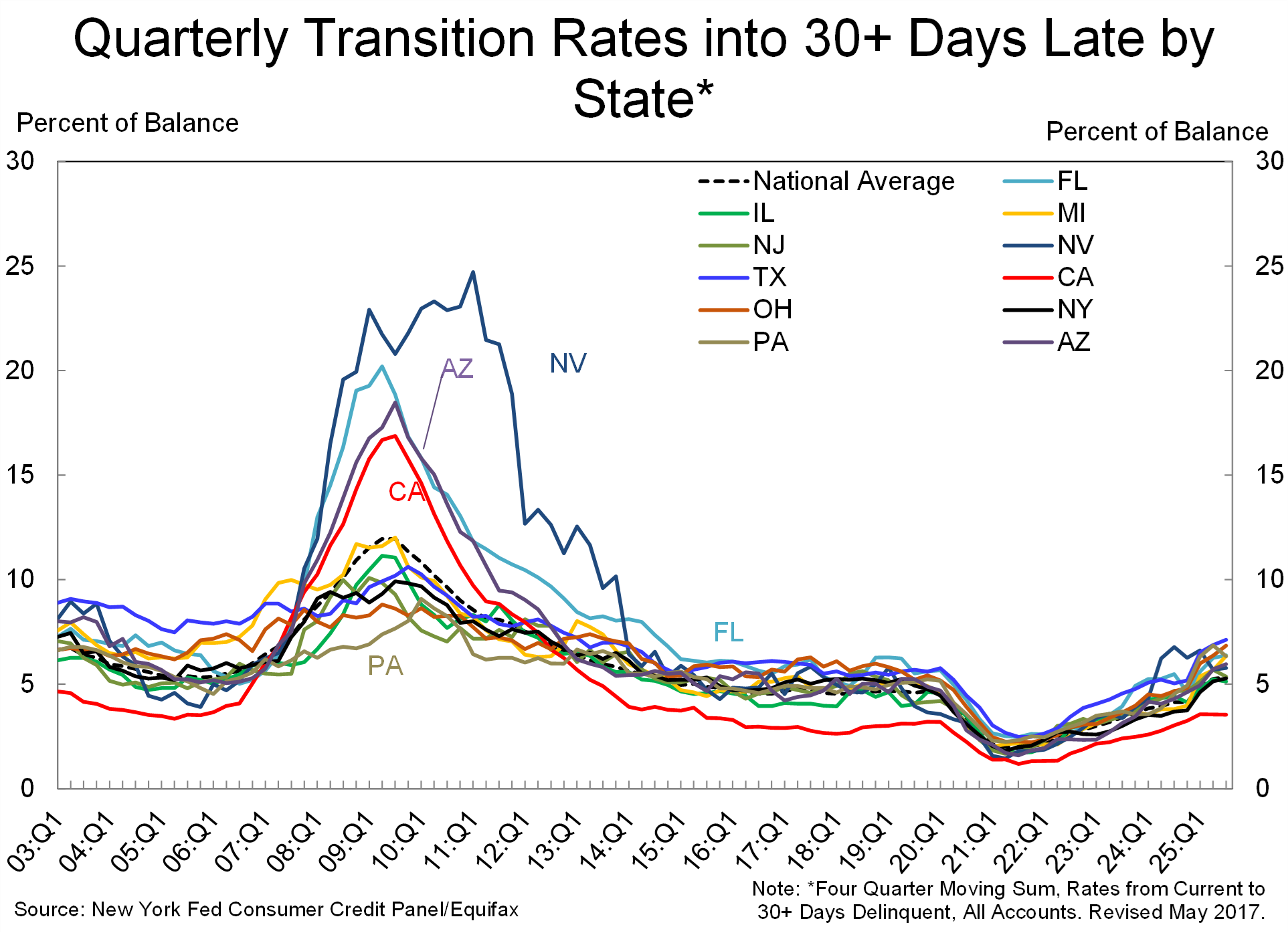 - Perhaps the most alarming statistic in this report is the quarterly transition rates into 30+ days late and 90+ days late, computed as the four quarter moving sum. For the 30+ days late segment, this figure was at 5.4% for New Jersey and 60 to 90+ days at 3.0%. As evident is the graphs below, there is a well-established trend of rising delinquencies, which could escalate if the New Jersey economy weakens.