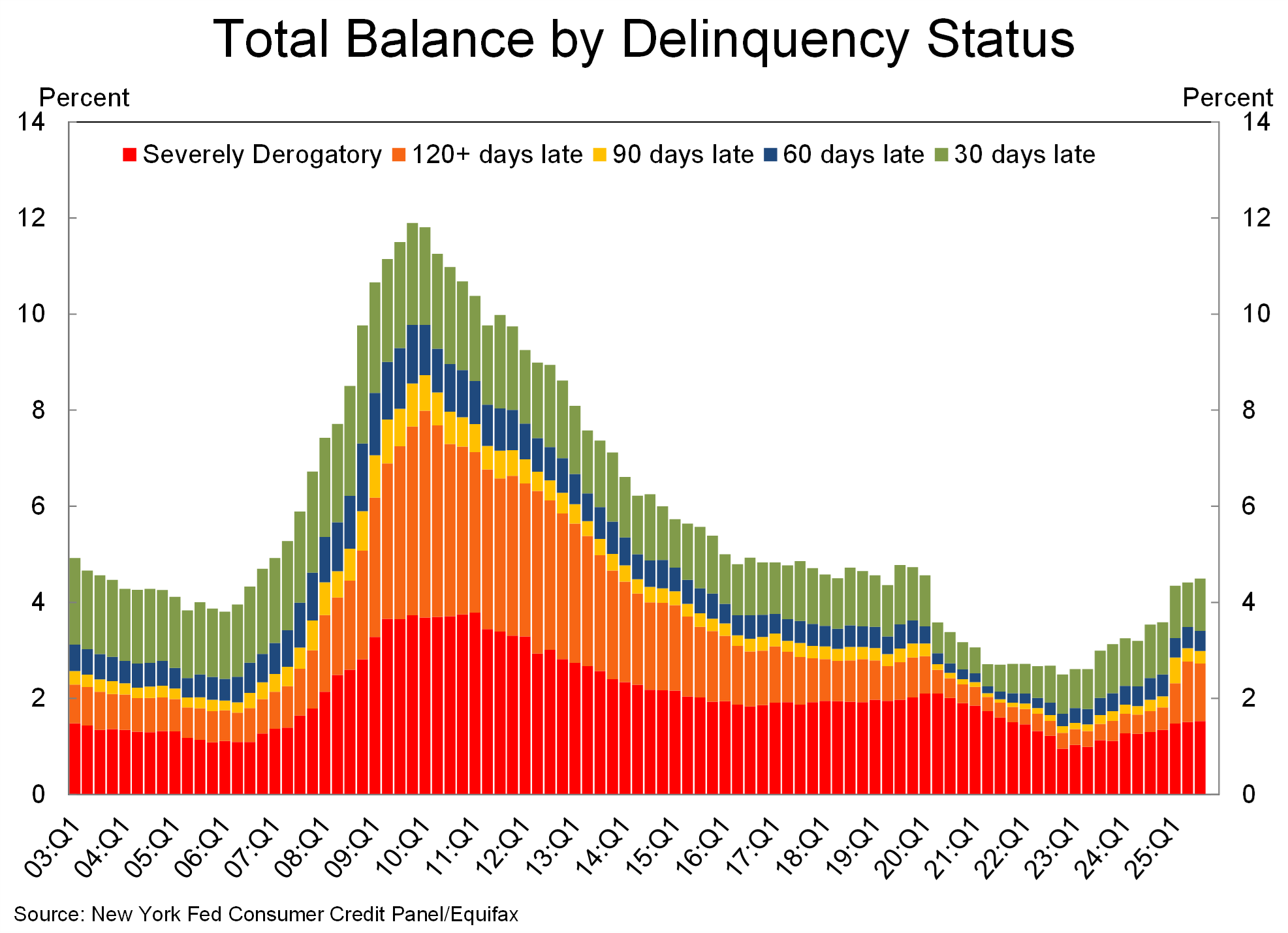 - The delinquency status is showing an uptick for New Jersey. The percent of balances that are 90+ days late stood at 3.0% in 2025Q3 versus 1.8% in 2024Q3. Nationally, the figure was at 3.0% as well for 2025Q3 versus2.0% in 2024Q3. Florida’s delinquency rate was the highest among all states at 4.1% in 2025Q3. These figures indicate that household stresses are emerging, which could get exacerbated if the labor market falters; layoff announcements have increased of late which imparts a negative tone for the future. Nationally, 4.5% of household debt was in some stage of delinquency in 2025Q3, up from 4.4% in 2025Q2, but this also related to the change in the reporting of student loan delinquency rates in 2025Q1. The national figures (second chart below) show that 30-day, 60-day, and 90-day delinquency rates have been flat over the past several quarters but the 120-day delinquency rate and the severely derogatory rate (defined by the New York Fed as a delinquency of any duration combined with a reported repossession, charge-off to bad debt, or foreclosure) have risen sharply during this year and are above pre-pandemic rates. For New Jersey, the 120+ days late and severely derogatory rate appears to be well contained at 1.4% in 2025Q3.